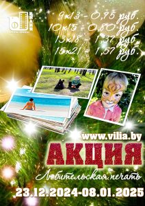 С 23.12.2023 по 08.01.2024 в сети салонов фото «ВИЛИЯ» действуют специальные цены на любительскую печать. Печать фотографий производится на мини-фотолаборатории, как известно — это качество и долговечность, возможность хранить яркие фотографии в семейном альбоме долгие годы!