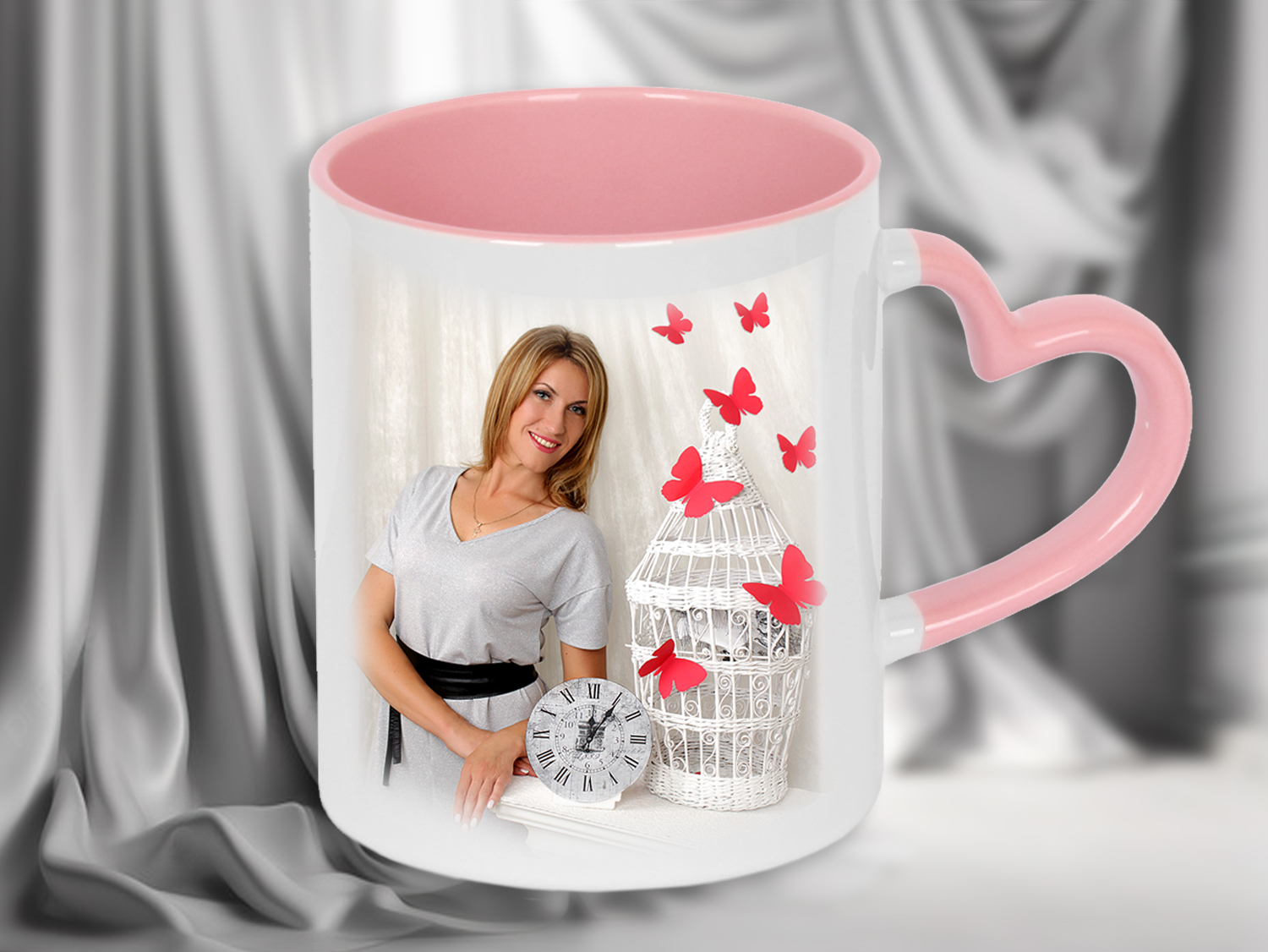 Очаровательная чашка с нежным дизайном, украшенная изображением бабочек и романтическими деталями. Ручка в форме сердца подчеркивает утонченность и женственность изделия, а внутреннее покрытие розового цвета добавляет тепла и уюта.