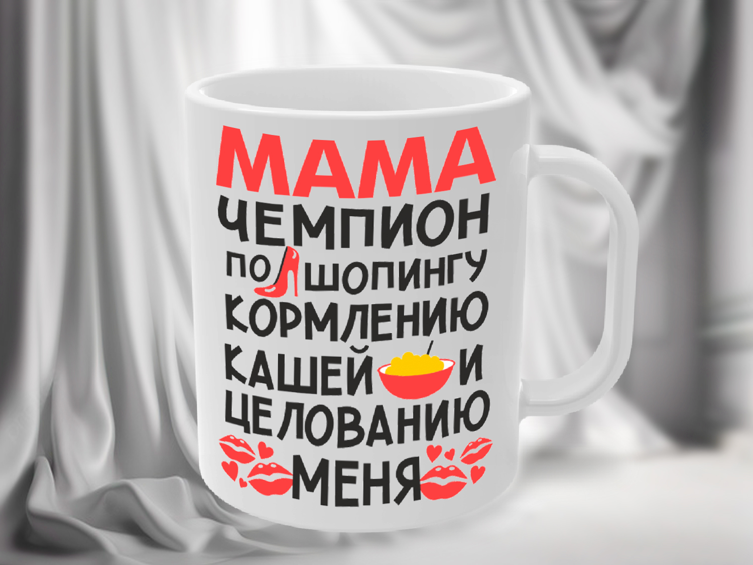 Кружка с яркой надписью «Мама — чемпион по шопингу, кормлению кашей и целованию меня» – это оригинальный способ выразить признание и добавить нотку юмора в повседневную жизнь. Белоснежный фон кружки украшен красными и черными акцентами, символизирующими энергичность, любовь и заботу. Декоративные элементы в виде тарелки каши и губ с поцелуями добавляют дизайну игривость.