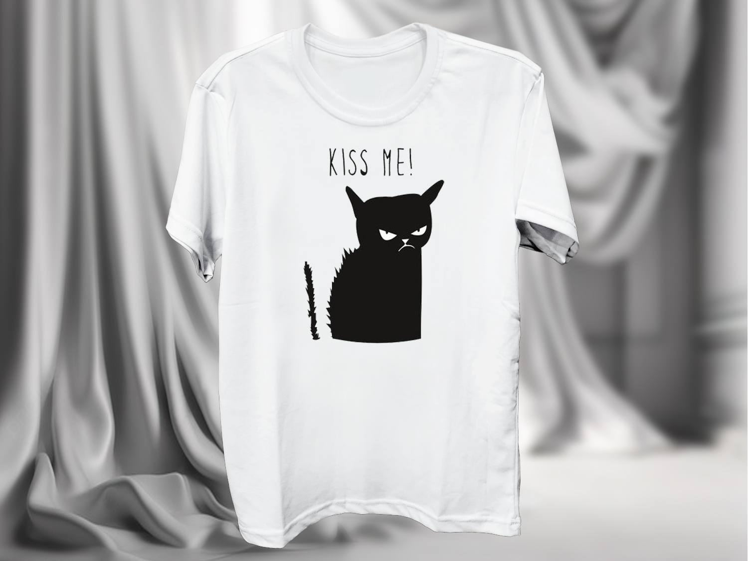 Эта майка с изображением недовольного кота и надписью «Kiss Me!» — идеальный выбор для любителей сарказма и юмора. Забавный дизайн подойдет для тех, кто любит оригинальные и немного дерзкие вещи. Такой принт обязательно вызовет улыбку у окружающих и станет отличным поводом для шутливых разговоров. Приобретайте уникальные сувениры с вашим дизайном, чтобы выразить свою индивидуальность с ноткой юмора.
