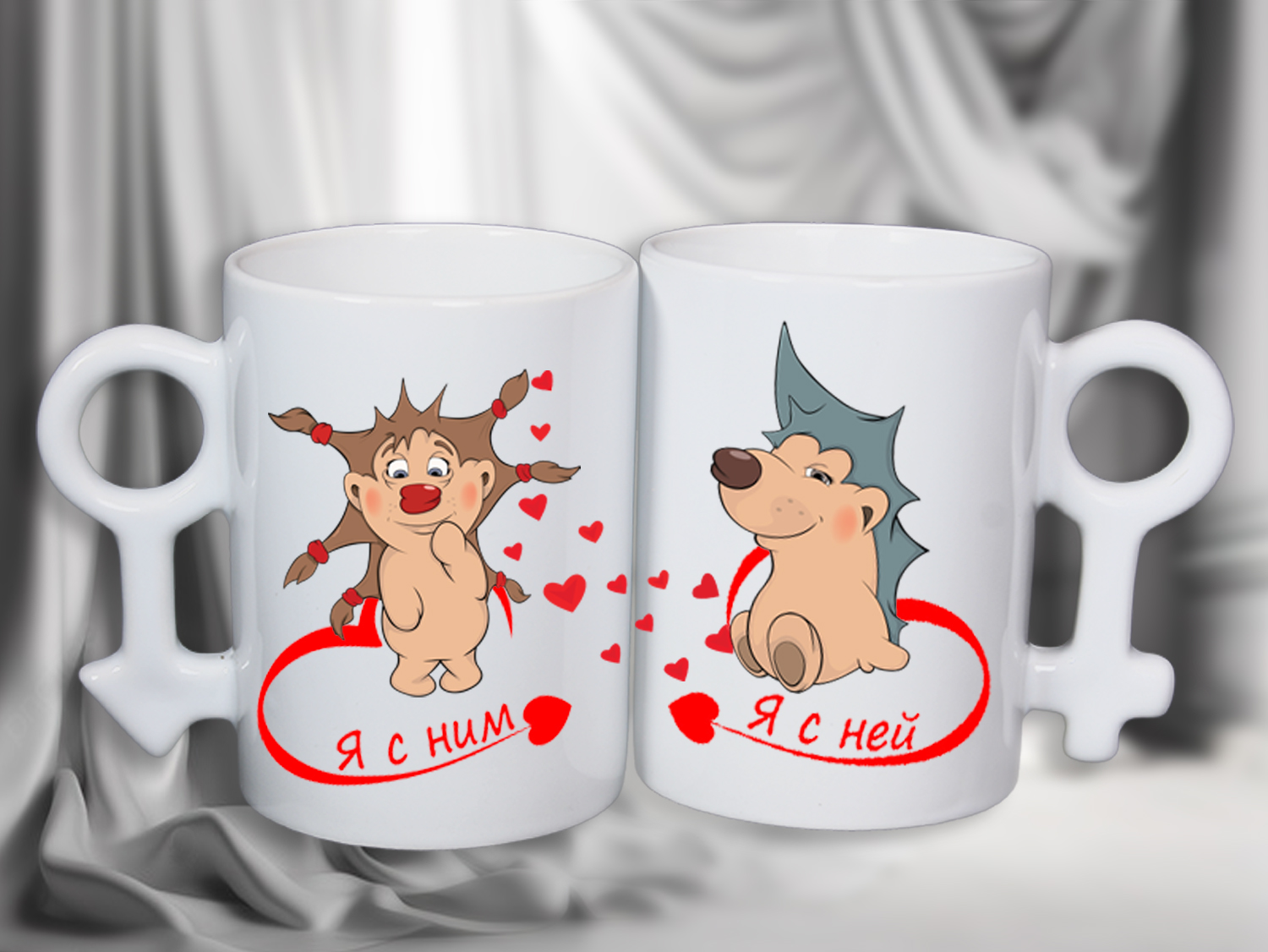 Две забавные чашки, которые идеально подойдут для пар, желающих подчеркнуть свою близость и любовь. Дизайн включает милые рисунки ежиков и тематические надписи, которые вызывают улыбку и создают уютную атмосферу.