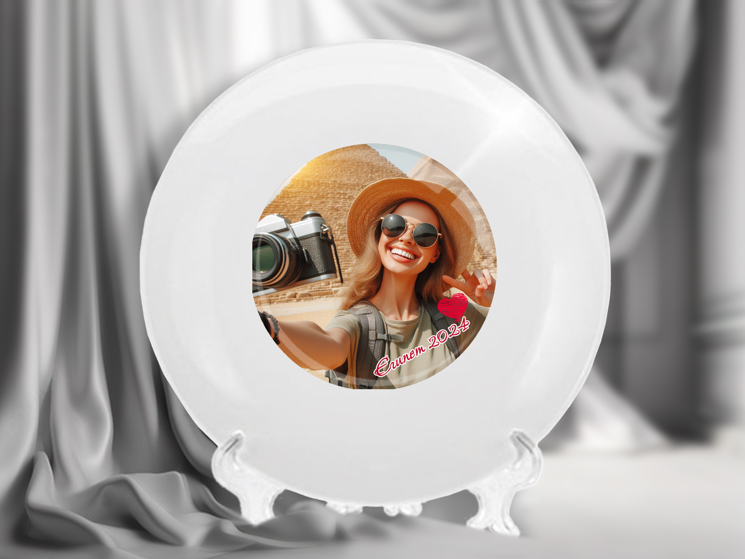 Эта тарелка с изображением счастливой туристки, позирующей на фоне пирамид, и надписью «Египет 2024» с сердечком — отличный памятный сувенир для тех, кто был покорен красотой Древнего Египта. Этот стильный подарок будет напоминать о захватывающем путешествии и особых моментах, проведенных в стране фараонов. Идеально для любителей истории и романтиков.