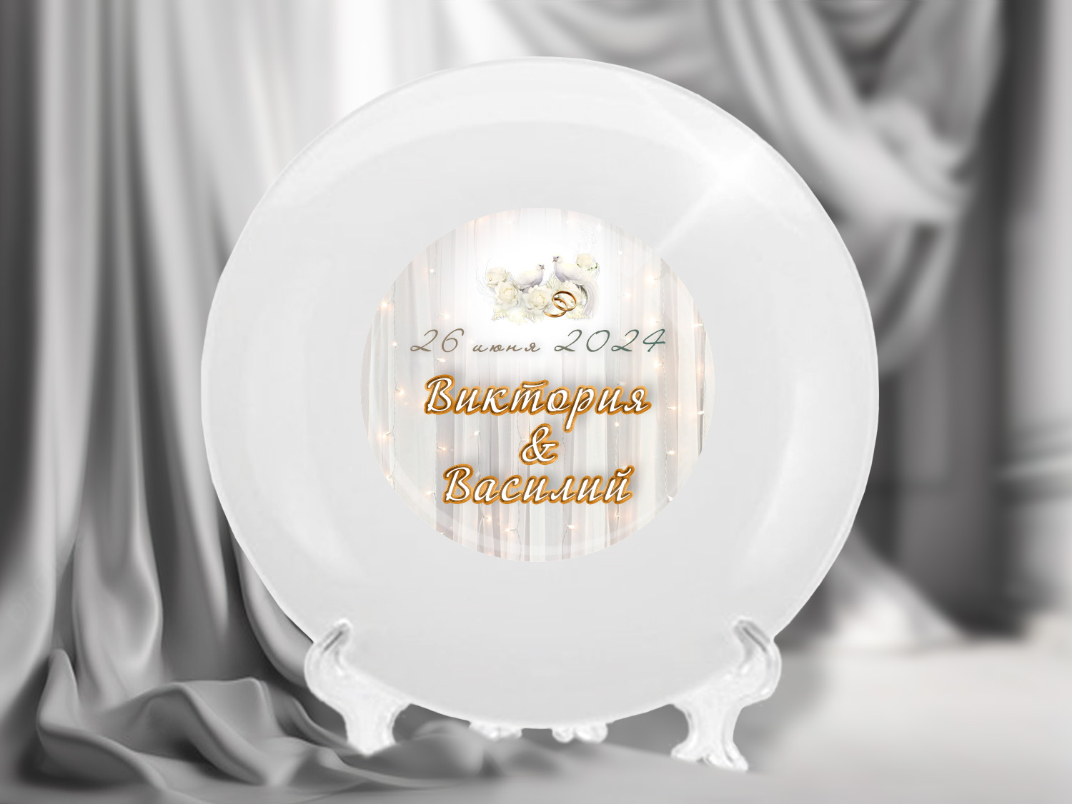 Эта свадебная тарелка с именами молодоженов и датой торжества — прекрасный способ запечатлеть один из самых счастливых дней в жизни. Изысканный дизайн с нежными деталями и светлым фоном подчеркивает торжественность события. Тарелка станет не только стильным элементом декора, но и вечным напоминанием о дне свадьбы. Она идеально подойдет в качестве подарка на свадьбу, годовщину или просто для того, чтобы украсить дом молодых. Керамическая поверхность обеспечивает долговечность изображения, а персонализация делает этот сувенир по-настоящему уникальным.
