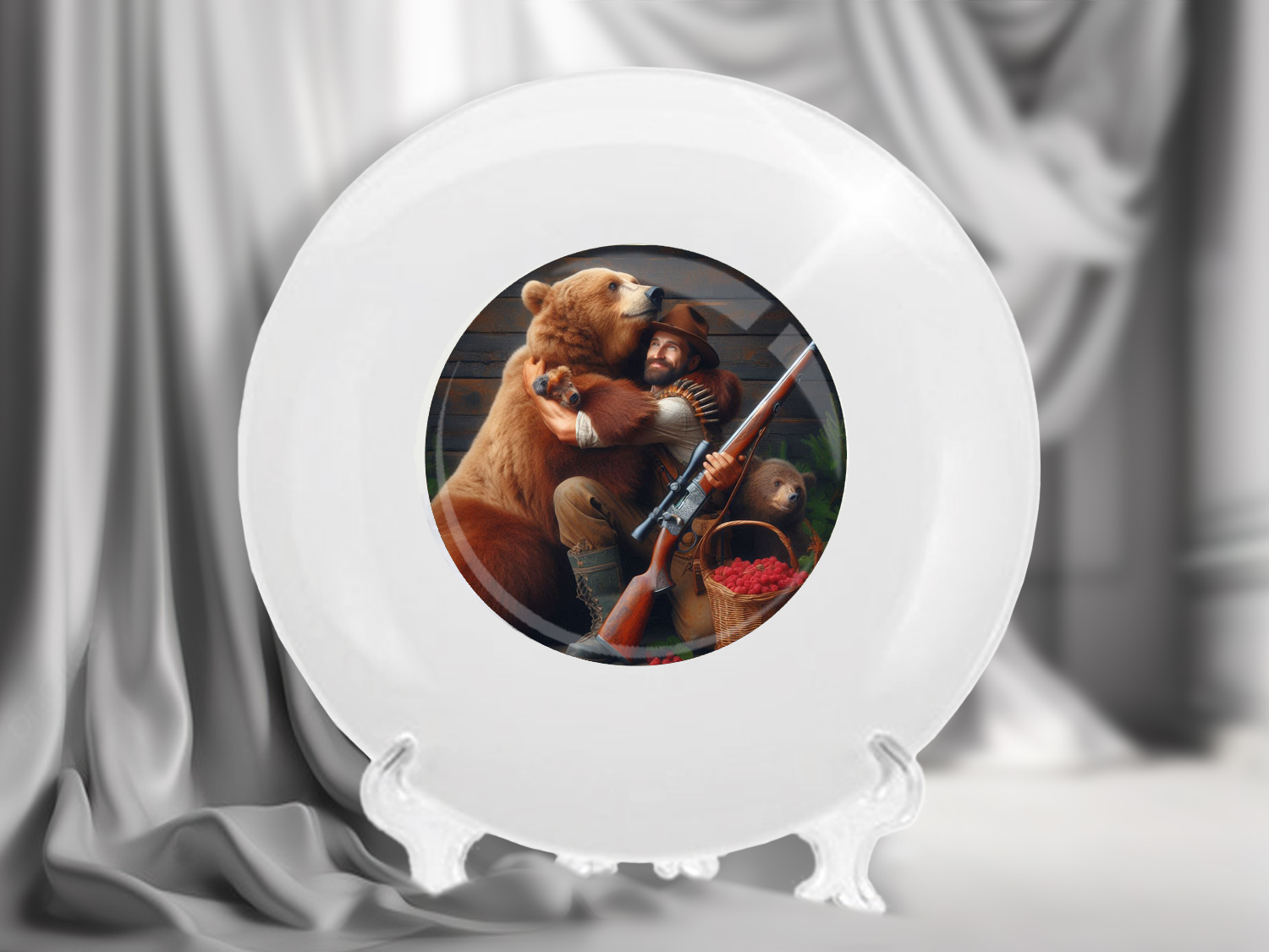 Эта тарелка с изображением охотника, обнимающего медведя, символизирует гармонию между человеком и природой. Такой сувенир станет отличным подарком для любителей природы, охоты и приключений. Тарелка будет напоминать о путешествиях и незабываемых встречах с дикой природой.