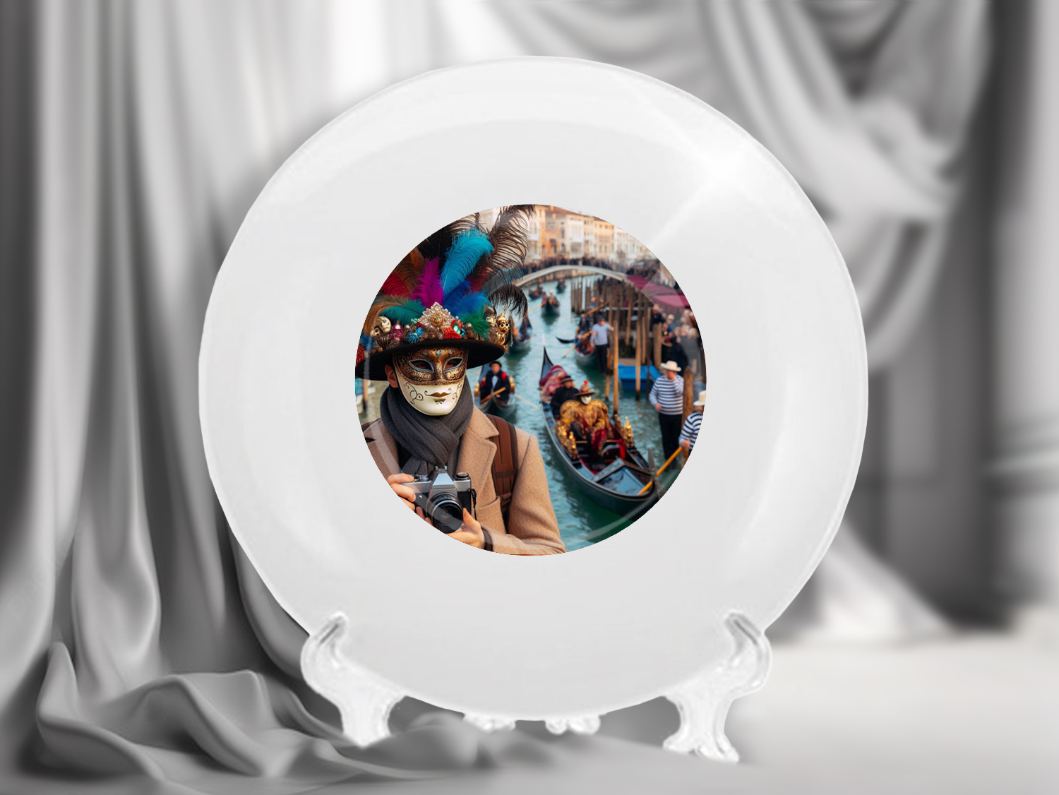 Эта тарелка с изображением фотографа на фоне венецианского карнавала — идеальный подарок для тех, кто увлечен фотографией и путешествиями. Красочные маски, гондолы и атмосфера праздника создают незабываемые впечатления, которые можно сохранить на этой сувенирной тарелке. Прекрасный вариант для тех, кто хочет запомнить одно из самых ярких событий в своей жизни.