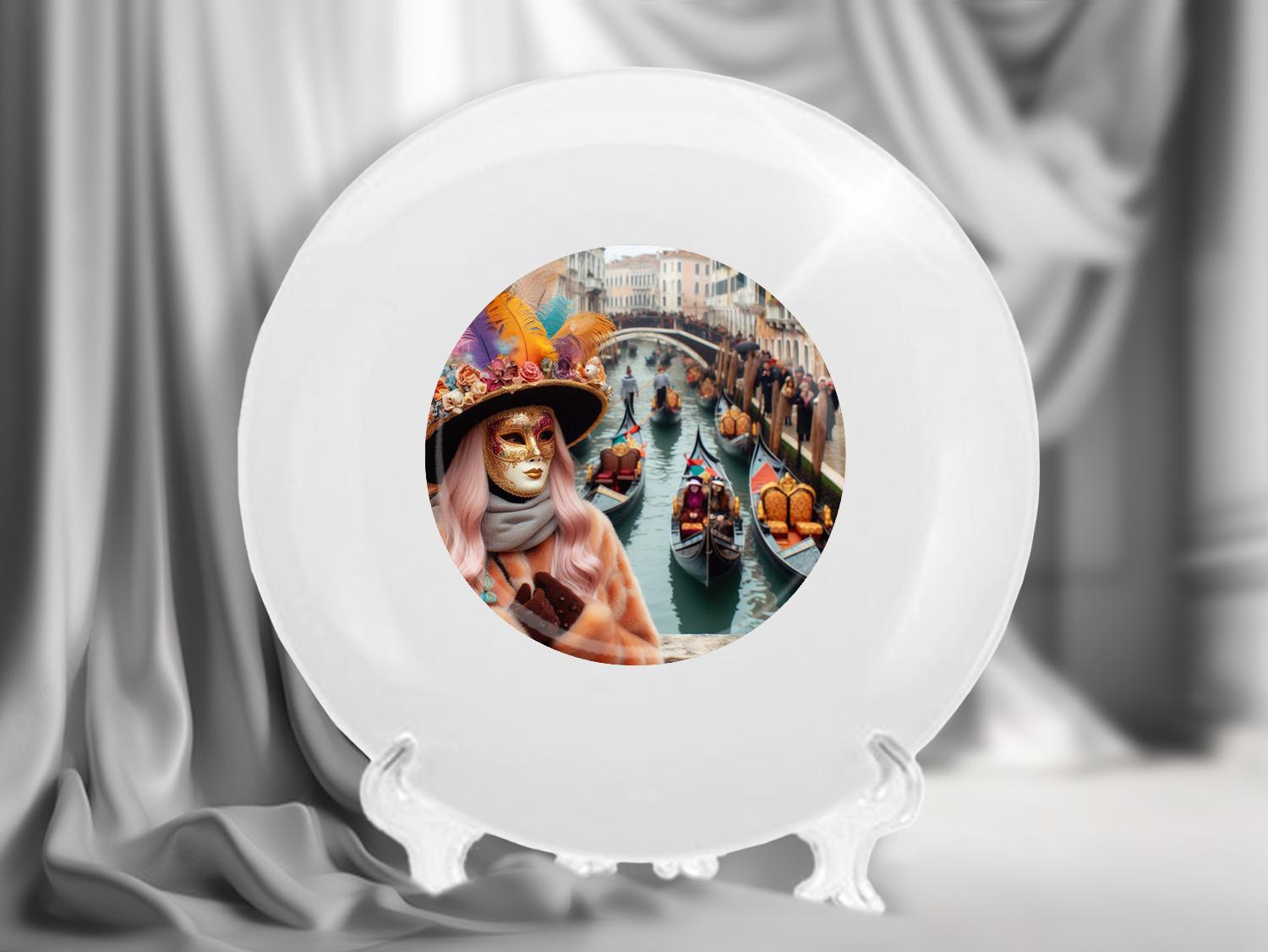 Эта тарелка с изображением участницы венецианского карнавала, одетой в яркий костюм с маской, передает атмосферу одного из самых знаменитых и красочных праздников мира. Венецианские гондолы на фоне каналов добавляют мистики и романтики. Такой сувенир станет замечательным подарком для любителей итальянской культуры и тех, кто мечтает окунуться в атмосферу карнавала.