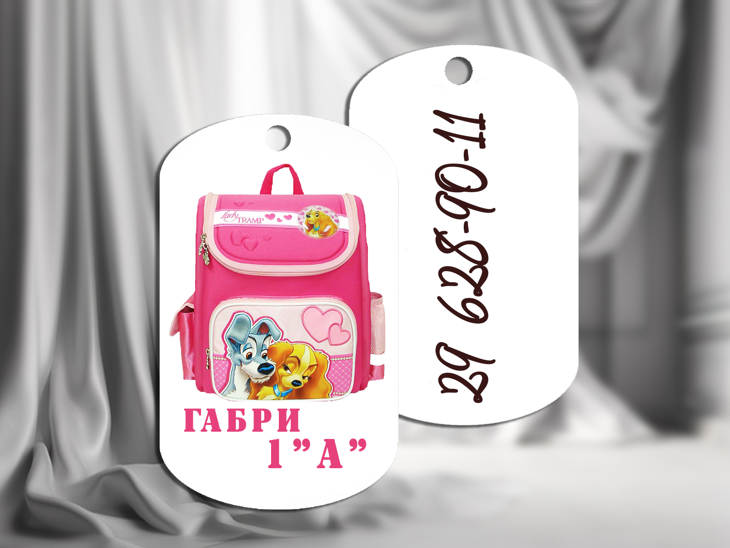 Этот жетон с изображением розового школьного рюкзака и именем Габри предназначен для маленькой школьницы, которая только начинает свой путь в учебе. Такой жетон будет полезен для идентификации вещей, а контактная информация на обратной стороне сделает его еще более практичным, помогая вернуть потерянные предметы.