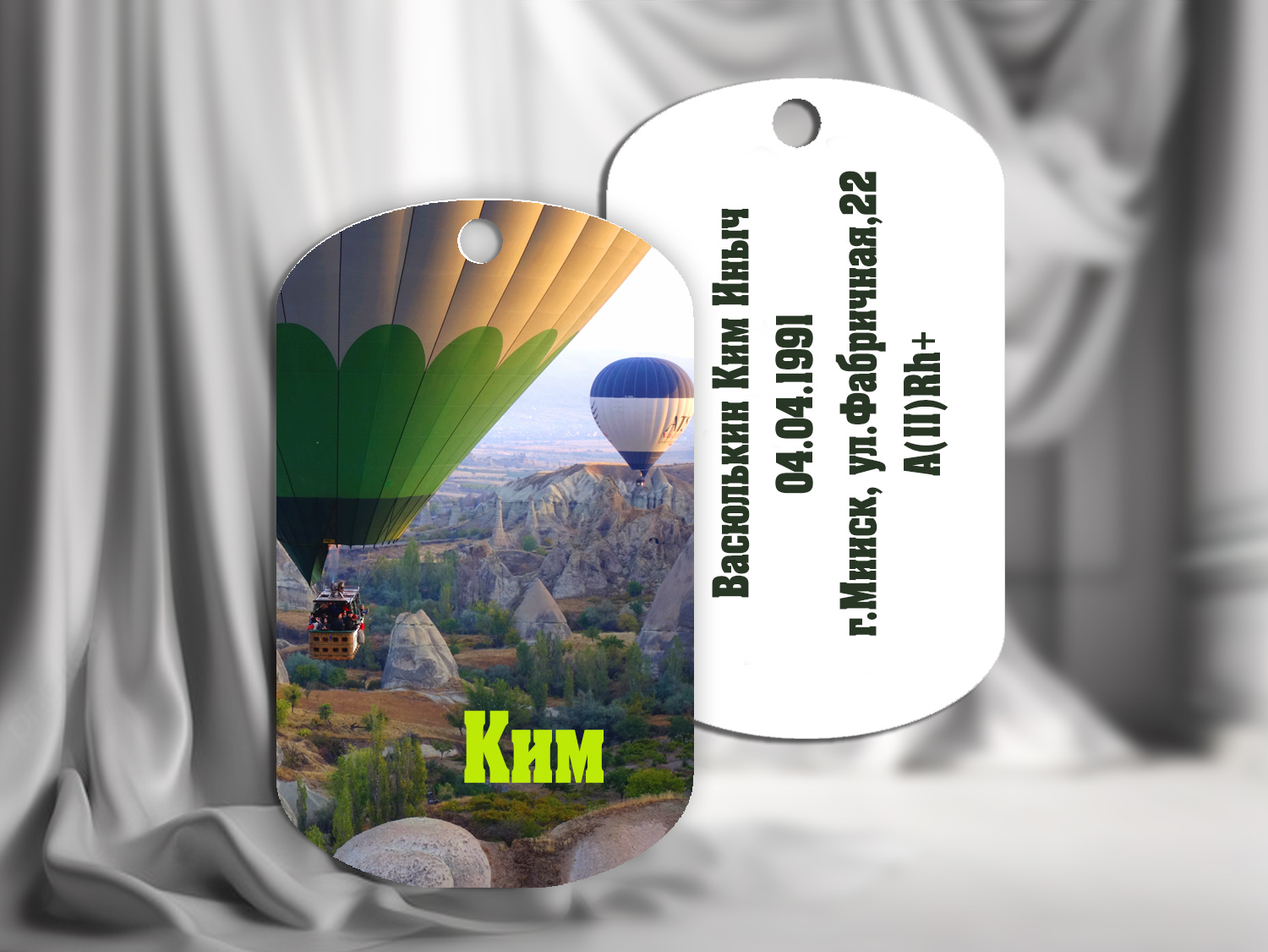 Этот жетон с изображением воздушного шара и именем «Ким» подчеркивает любовь к приключениям и свободе. На обратной стороне указаны важные данные, такие как дата рождения, группа крови и адрес. Такой жетон подойдет для тех, кто ценит романтику полетов и путешествий по воздуху.