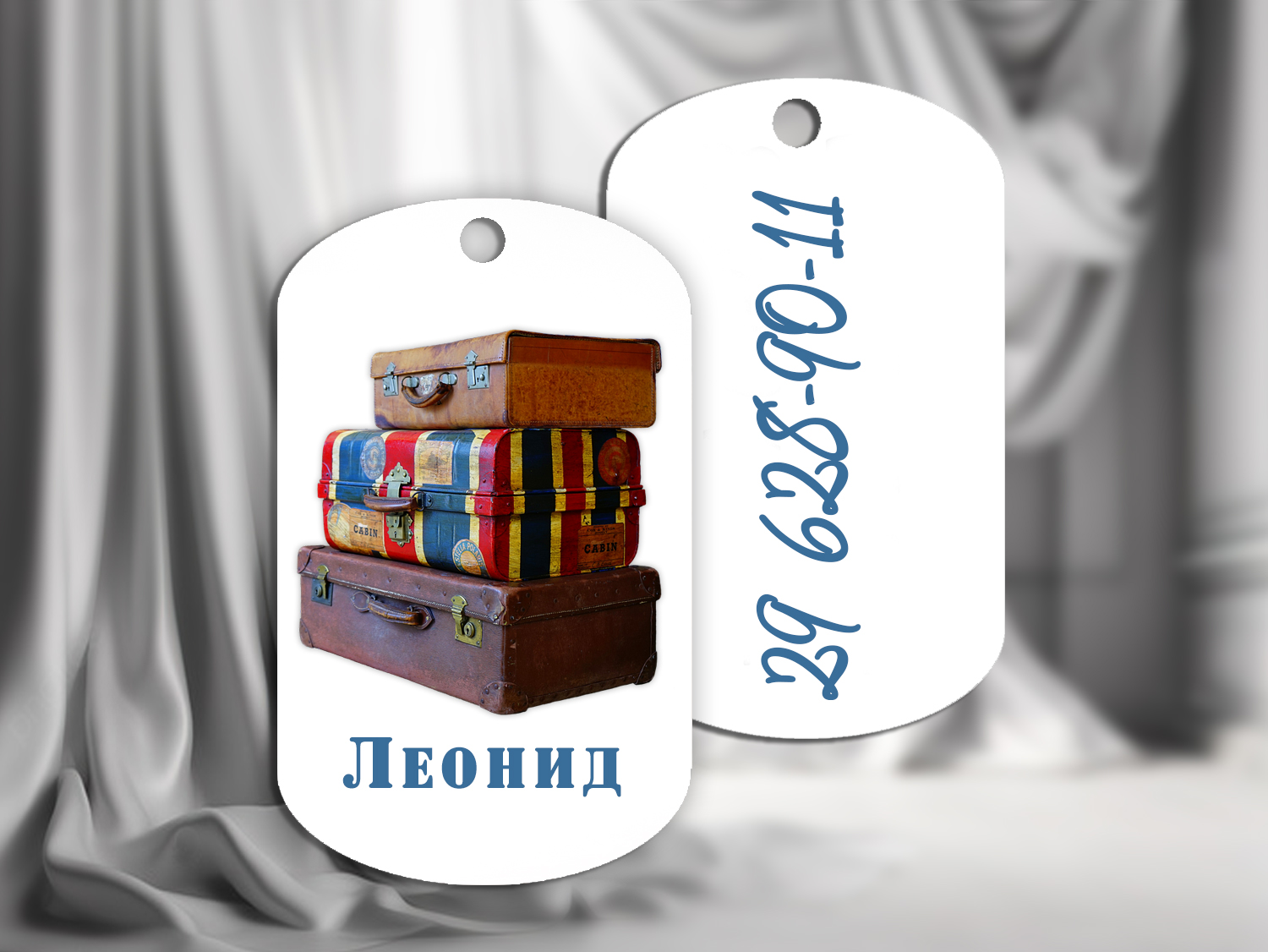 Этот жетон с изображением стопки винтажных чемоданов и именем «Леонид» прекрасно подойдет для тех, кто любит путешествовать и открывать новые горизонты. Личные данные на обратной стороне помогут вернуть утерянные вещи, что делает этот жетон не только стильным, но и полезным в поездках.